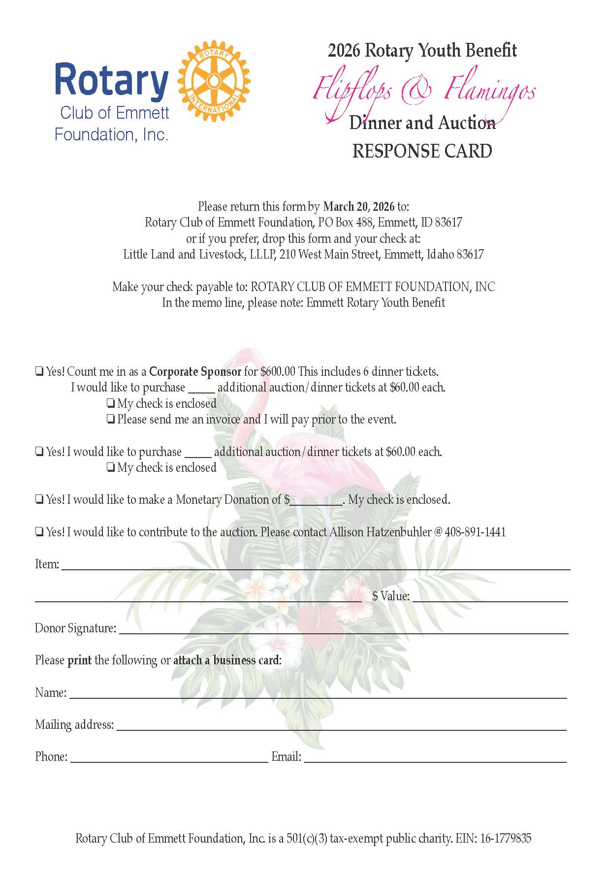 Make your check payable to: Rotary Club of Emmett Foundation, Inc.